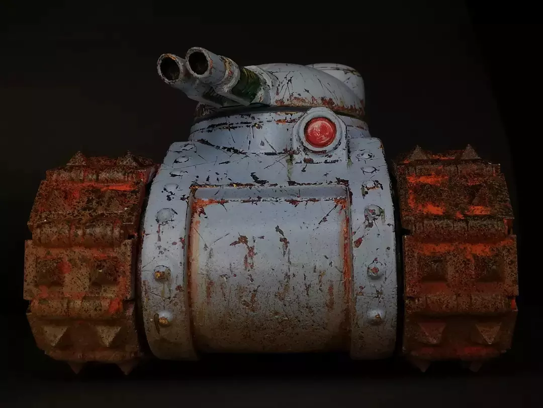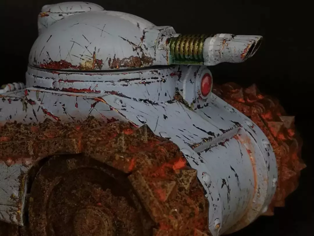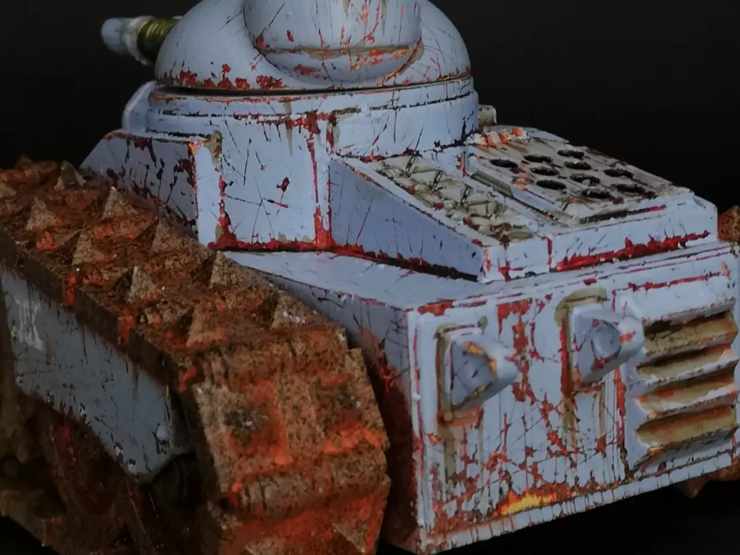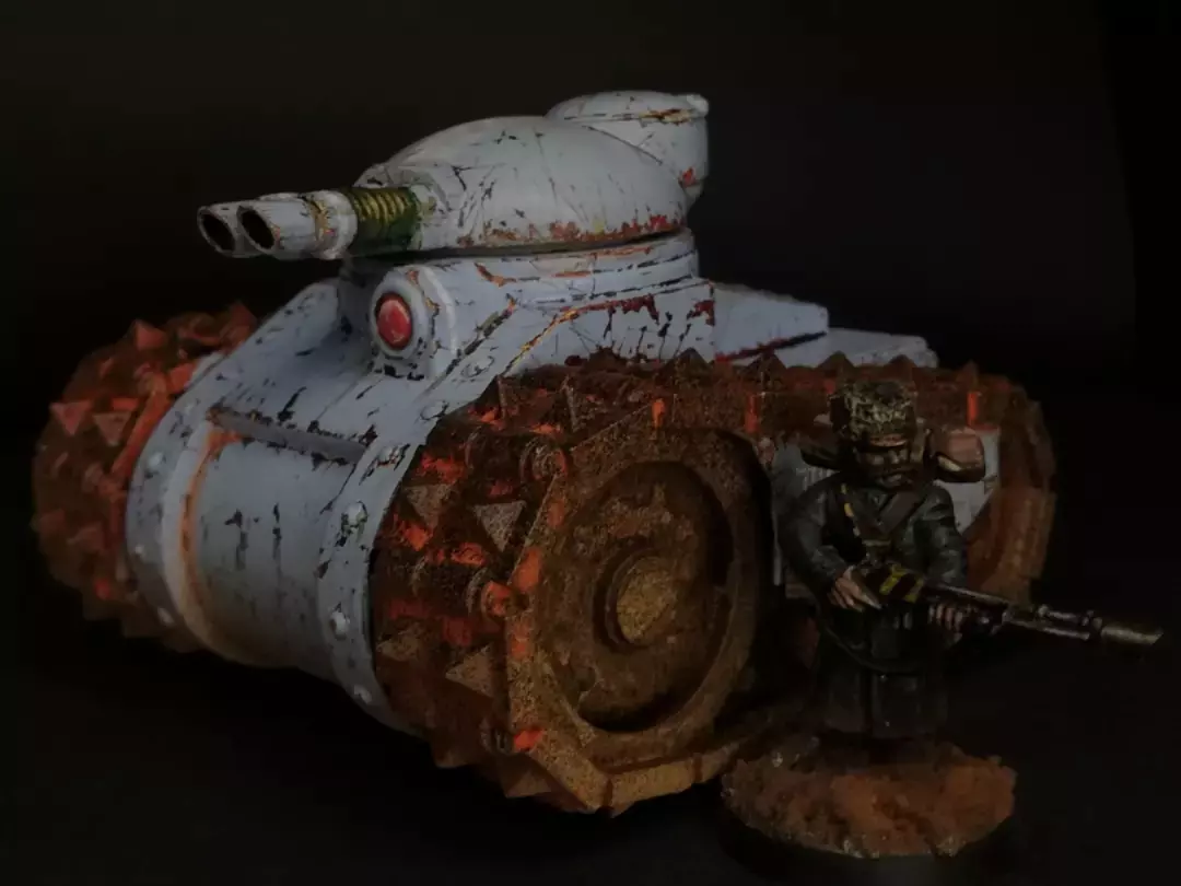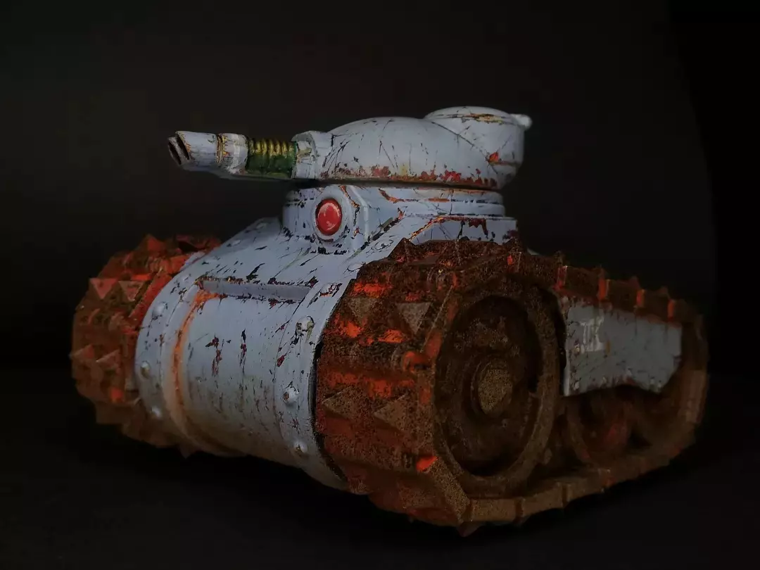The mauler mk1 laser tank is a 4 part resin kit. Armed with twin linked laser cannons on its rotating turret, carried forward on rock crushing spiked tracks, and armoured with more metal than the playlist at your local comic shop, the mauler is a chunky little beast of a tank.